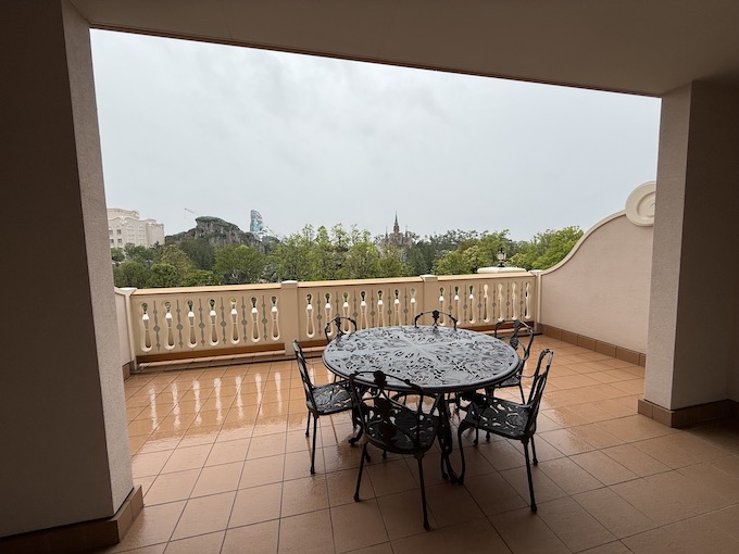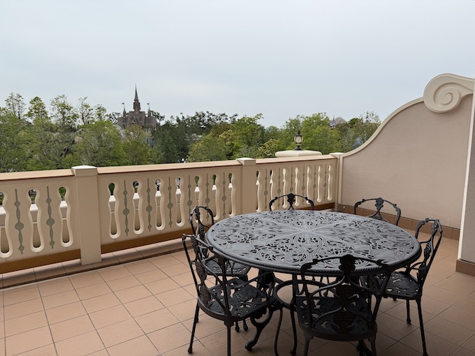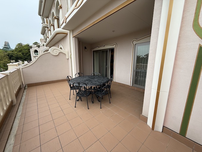 15:00にパークから戻ってきて真っ先にお部屋に向かいました。とりあえず息子と二人で大人気なくテラスに直行してパシャリ。この部屋は4名まで宿泊可能ですがテラスのテーブルには椅子が6脚ついておりました!ホーンテッドマンションから愉快な友達を連れ帰ってきてしまっても2名までなら大丈夫ですね!