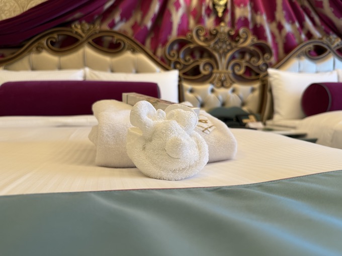 テラスよりも部屋そのものが素敵なアトラクションでした。例えば、チェックインをしたらミニーちゃんのタオルアートがありました。これは4歳児にとって嬉しいサプライズです!