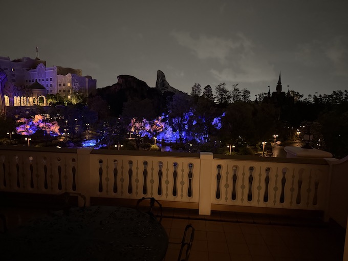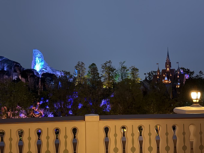 続いて夜のテラスをご紹介。夜は青く輝く泉とその向こうに栄えるファンタジースプリングスホテルのファンタジーシャトーのチェックインラウンジが見えました。右端の方に見えているシルエットはアレンデール城です。