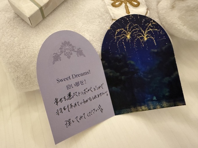 そして、ラ・リベリュールでディナーを食べて部屋に戻ってきたらターンダウンが終わっており、トンボのタオルアートのサプライズがありました。これも子供からすると宝探し要素となり、ワクワクサプライズになりました。