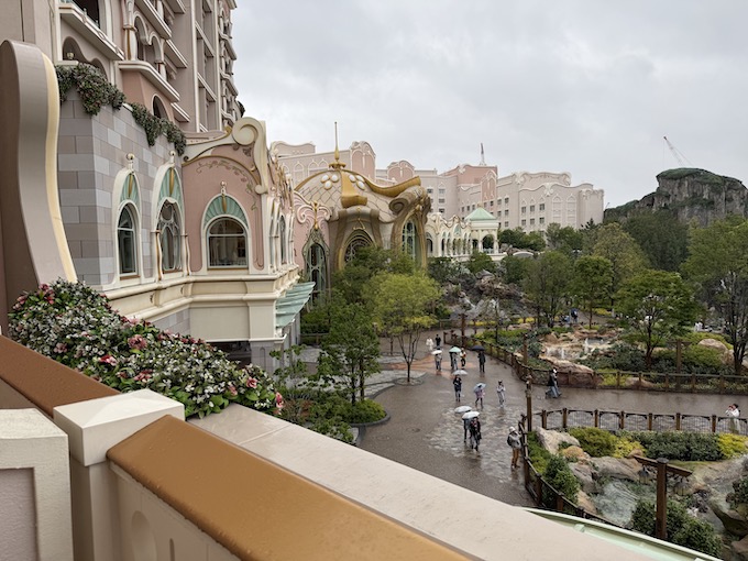 ちなみにパークを覗き込むとこんな感じ。我が家が宿泊したのはちょうどファンタジースプリングス・ギフトの真上あたり。あいにくの雨でしたが、雨だからこそパークの混雑具合を見ながら、いつ覚悟を決めてパークに突撃するか決められました。