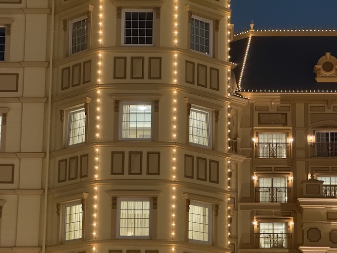 上から3フロア目の電気がついているのが我家が宿泊した6515のお部屋です。パーク正面に近いタレットのところに位置しています。